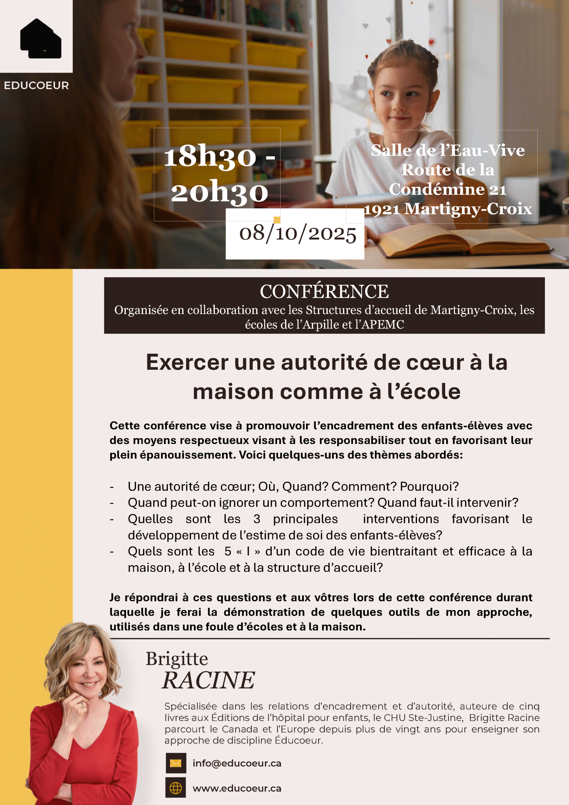 En collaboration avec les structures d’accueil de Martigny-Croix et l’Association des Parents d’Elèves de Martigny-Combe (APEMC), les Écoles de l’Arpille ont le plaisir de vous inviter à une conférence exceptionnelle animée par Brigitte Racine.